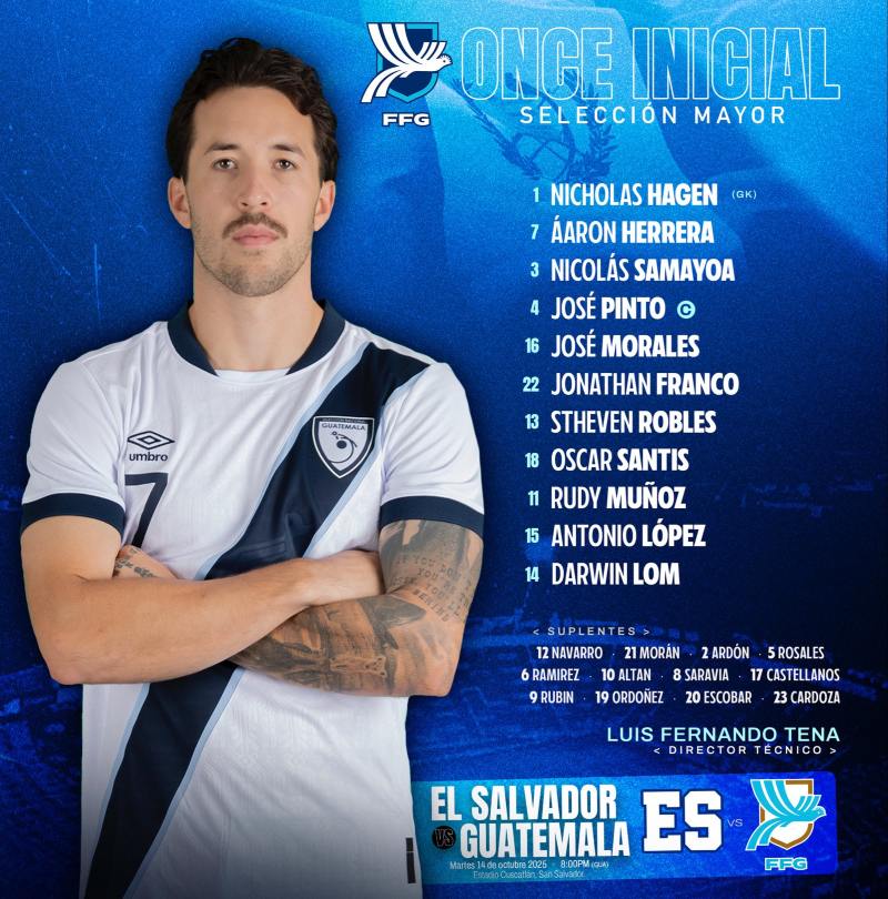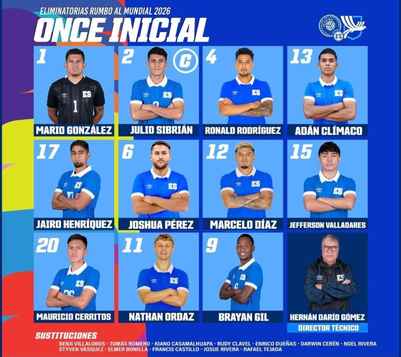Confirmada la alineación titular de El Salvador. Debido a las bajas, "Bolillo" Gómez cambia a línea de cuatro defensas. Mario González, titularísimo en el arco; la dupla central forma con Julio Sibrián (capitán) y Ronald Rodíguez, mientras que en los laterales salen Jefferson "Piba" Valladares por derecha y Adán Clímaco por izquierda. Dos volantes de marca con Mauricio Cerritos y Marcelo Díaz (no va Darwin Cerén) y luego tres mediapunta, con Jairo Henríquez, Joshua Pérez y Nathan Ordaz, más Brayan Gil como único hombre en punta. Es un 4-2-3-1 que en teoría podría ser muy ofensivo.