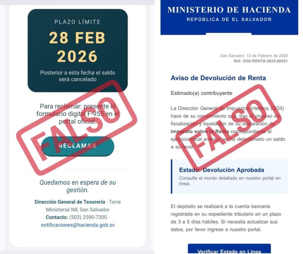 El Ministerio de Hacienda alertó sobre una nueva estafa digital en El Salvador que utiliza correos electrónicos falsos para prometer supuestas devoluciones de renta o pagos “a favor” de los usuarios. Los mensajes incluyen enlaces que redirigen a sitios web fraudulentos diseñados para robar información personal y bancaria. La institución reiteró que no gestiona devoluciones por correo electrónico ni solicita datos financieros mediante links externos. Además, recordó que sus comunicaciones oficiales solo utilizan direcciones con el dominio @mh.gov.sv. Las autoridades recomiendan no abrir enlaces sospechosos, verificar siempre la fuente y reportar intentos de fraude a través de mh.gob.sv o llamando al 2299-9999.