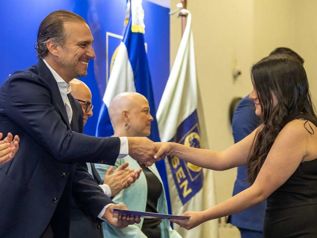En este sentido, la actividad incluyó testimonios de estudiantes beneficiados. Farrell Zabanet, estudiante de quinto año de la Licenciatura en Economía y Negocios y becario de la Fundación Strachan, compartió un mensaje centrado en el crecimiento personal y el liderazgo.