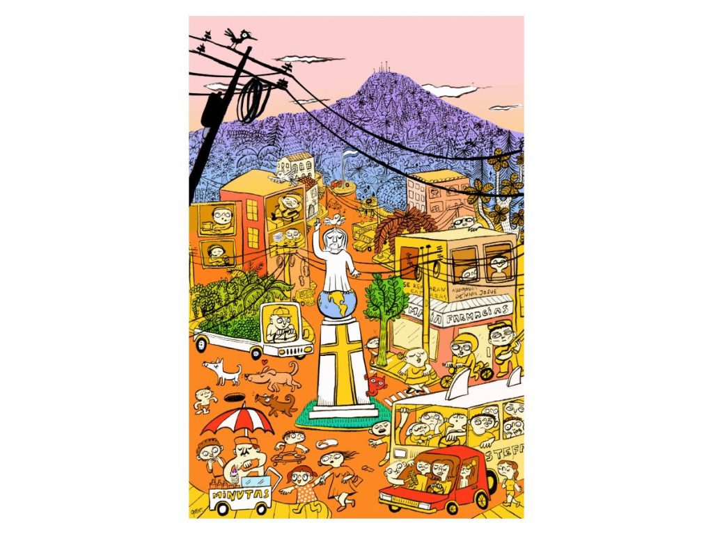 Esta obra es una muestra ejemplar de todos estos subtextos. Acá podemos observar cómo era alrededor de El Salvador del Mundo en la década de los 2010: su tráfico y la cultura del transporte colectivo, el trabajo de call centers, los ladrones mientras la ciudad está llena de vigilantes y al fondo, el Ferrari que chocó en el Redonde Masferrer en 2014. Cortesía/ Gabriel Granadino