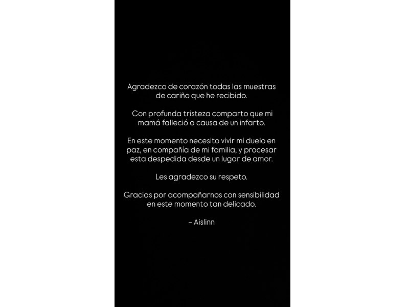 “Con profunda tristeza comparto que mi mamá falleció a causa de un infarto”, expresó Aislinn Derbez. “En este momento necesito vivir mi duelo en paz, en compañía de mi familia, y procesar esta despedida desde un lugar de amor”, agregó.
