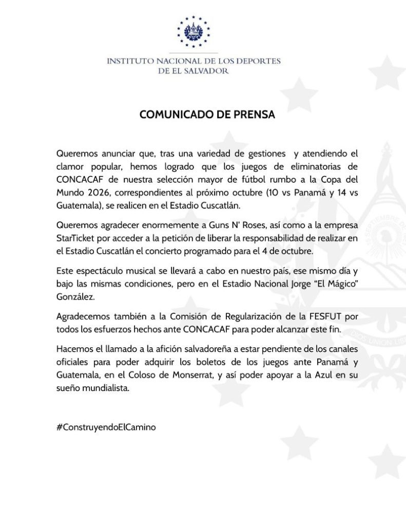 ¿Por qué está la FESFUT informando del cambio de este concierto de rock? Porque esta modificación permitirá que la Selección sí pueda ocupar el Estadio Cuscatlán para sus dos próximos partidos de la eliminatoria al Mundial 2026, el 10 de octubre contra Panamá y el 14 de octubre frente a Guatemala.