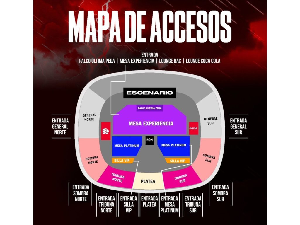 En el costado norte de estadio está la entrada general norte. Al lado de la entrada general norte, justo por donde se ubica el escenario, estarán Palco última peda, Mesa experiencia, Lounge Bac y Lounge Coca Cola. Del otro lado, del costado sur, está la entrada general sur. Del costado frente al escenario están las entradas para sombra norte, tributa norte, silla VIP, platea, mesa platinum, tribuna sur y sombra sur.