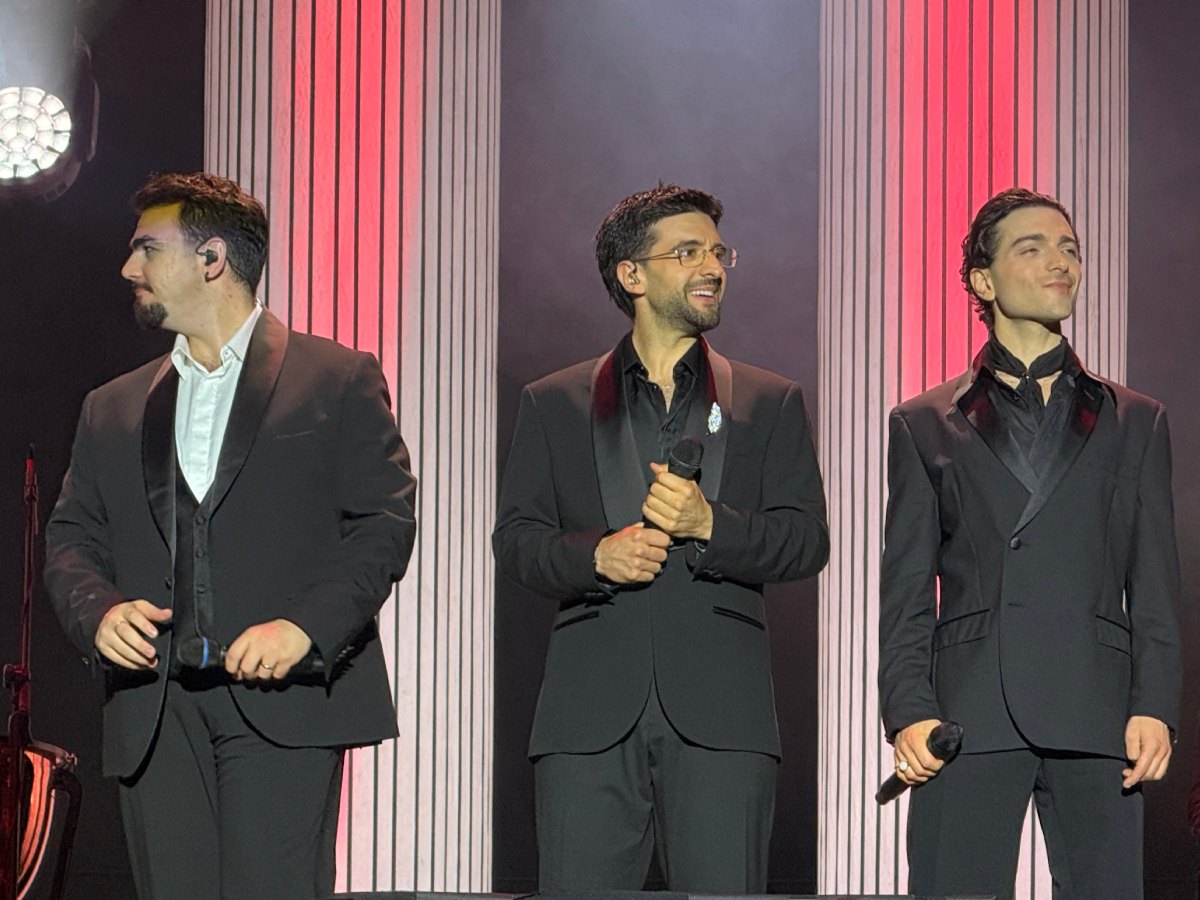 Poco después, alrededor de las 9:30 p.m., el escenario se iluminó para recibir a Piero Barone, Ignazio Boschetto y Gianluca Ginoble, quienes aparecieron acompañados por una orquesta compuesta por decenas de músicos. El público reaccionó de inmediato con aplausos y gritos de emoción mientras comenzaban los primeros acordes del espectáculo.