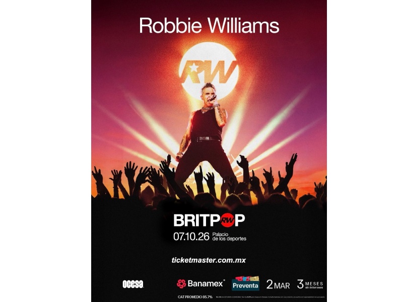 Robbie Williams anunció un concierto en el Palacio de los Deportes de la Ciudad de México como parte de su gira “Britpop”. El show se realizará el 7 de octubre de 2026 y marcará su regreso con una presentación en solitario, luego de su última visita en 2023. La preventa de boletos será el 2 de marzo para tarjetahabientes Banamex y la venta general iniciará el 3 de marzo. El espectáculo forma parte de la promoción de su álbum “Brit Pop”, lanzado el 16 de enero de este año. Aún no se han confirmado horarios ni precios oficiales.