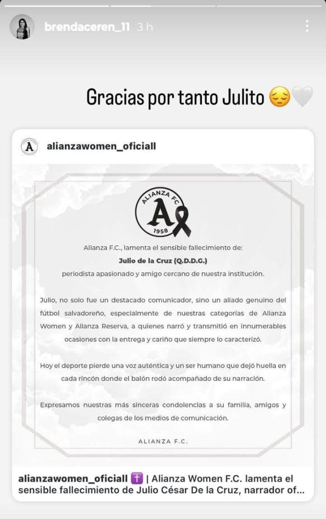 "Gracias por tanto, Julito", escribió Cerén en Instagram acompañado de una carta de pésame de Alianza ante la triste noticia que ha conmovido profundamente a todos los que conocían al comunicador salvadoreño.