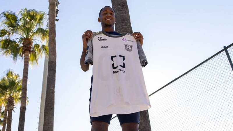 Brayan Gil posa con su nueva camiseta en Antalya, Turquía, donde el Baltika FC se entrena para la segunda parte del torneo de Primera División, segundo nivel del fútbol ruso detrás de la Premier. Foto: Cortesía FC Baltika