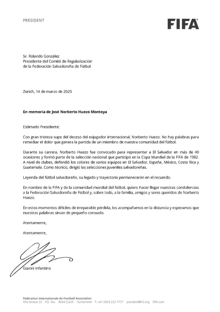 En la misma, Infantino hace un breve repaso por la vida profesional de Huezo, así como también, aprovecha para enviar el respectivo pésame.