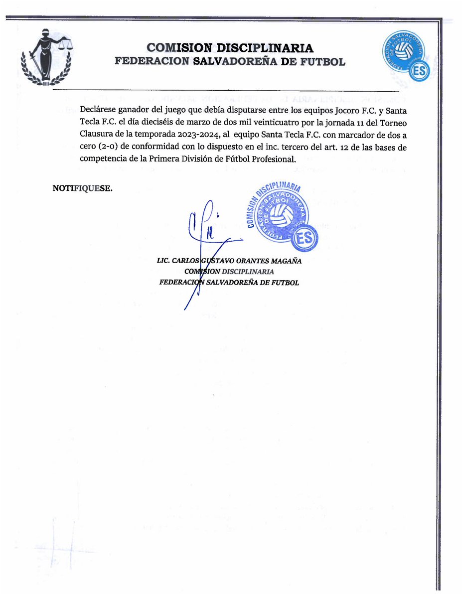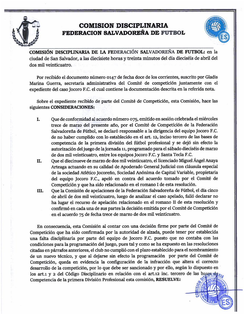 De manera oficial, Jocoro FC perdió el partido programado ante Santa Tecla por la fecha 11 del Clausura 2024, con lo que cedió tres puntos más en la lucha por el descenso ante el cuadro tecleño, luego que la Comisión Disciplinaria de la Fesfut tomara nota del rechazo de la apelación presentada por los morazánicos.