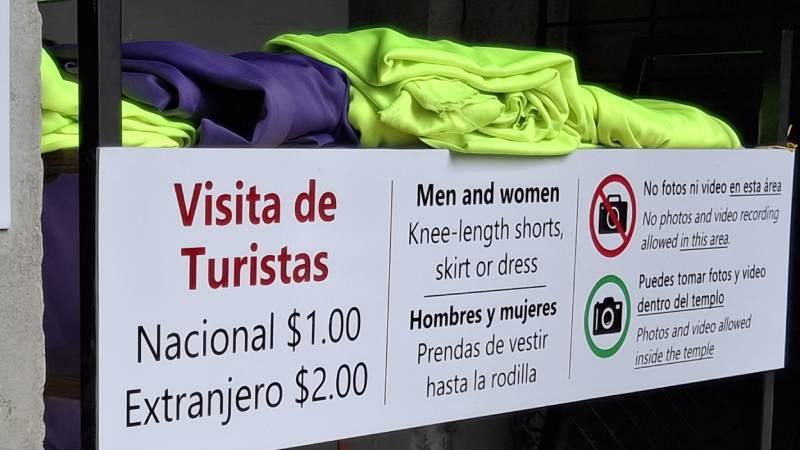 En caso de acudir con ropa corta, la persona encargada entrega al visitante un pañuelo grande —popularmente llamado “arapo”— de color verde fluorescente o morado, para que se lo coloque sobre el short o la falda. Este no tiene costo adicional.