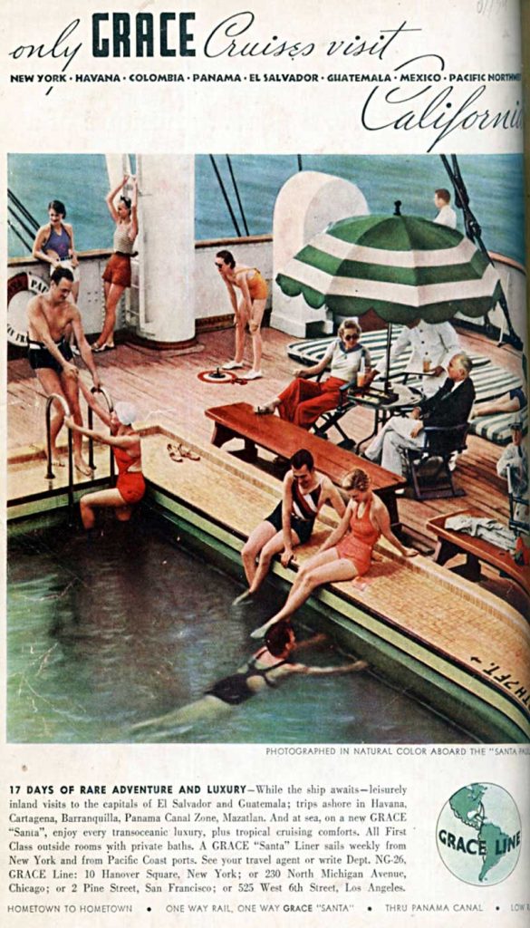 Fotografía coloreada de un anuncio publicitario de la empresa de cruceros Grace Line de los años 20 del siglo XX. Estos cruceros hacían para en El Salvador y los turistas visitaban San Salvador cada 15 días.