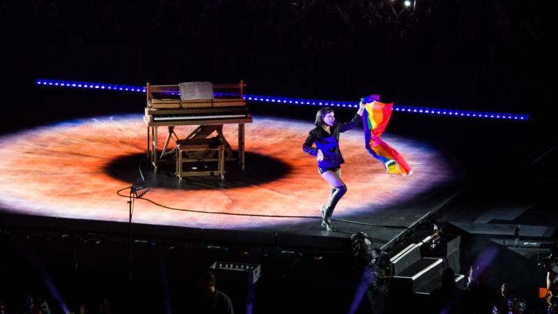La artista sorprendió a los asistentes durante su tema "Abracadabra", en donde al cambiar de vestido tenía otro con los colores de la bandera de Brasil. Foto EDH/ AFP