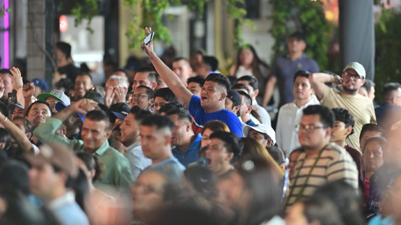 Los asistentes reunidos en la plaza Morazán pudieron ver el discurso a través de pantallas. Foto EDH/ AFP