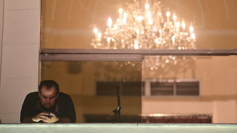 Un fotógrafo de la Secretaría de Prensa revisa su material a la par de un micrófono, en el que se esperaba que Bukele utilizara para dirigirse a los asistentes, lo que no ocurrió. Foto EDH/ Francisco Rubio