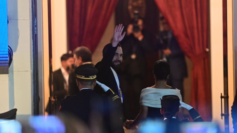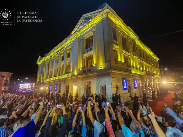 Los asistentes no perdían de vista los instantes del paso de Bukele mientras entraba al teatro. Foto EDH/ cortesía Secretaría de prensa de la presidencia.