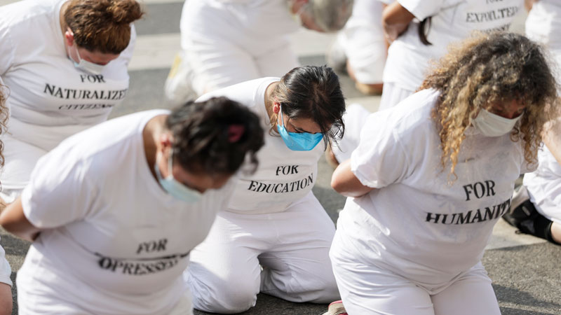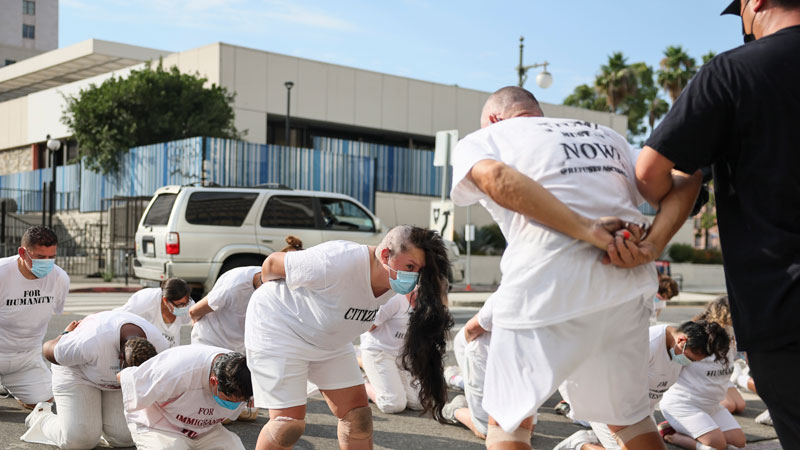 Arte y Activismo: La performance se desarrolló en el exterior del Edificio Federal Edward R. Roybal, epicentro de la jornada de acción.