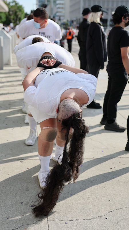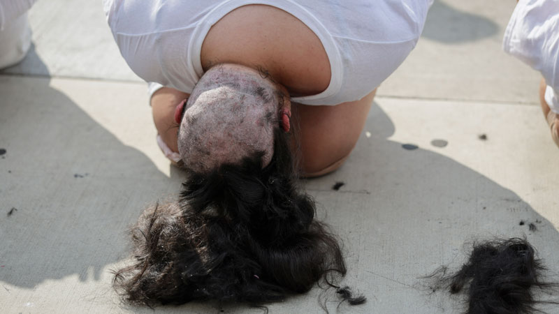 Acto de Rebeldía: Un primer plano de la cabeza siendo rapada, mientras "la audiencia" observa la pieza de arte performativo.