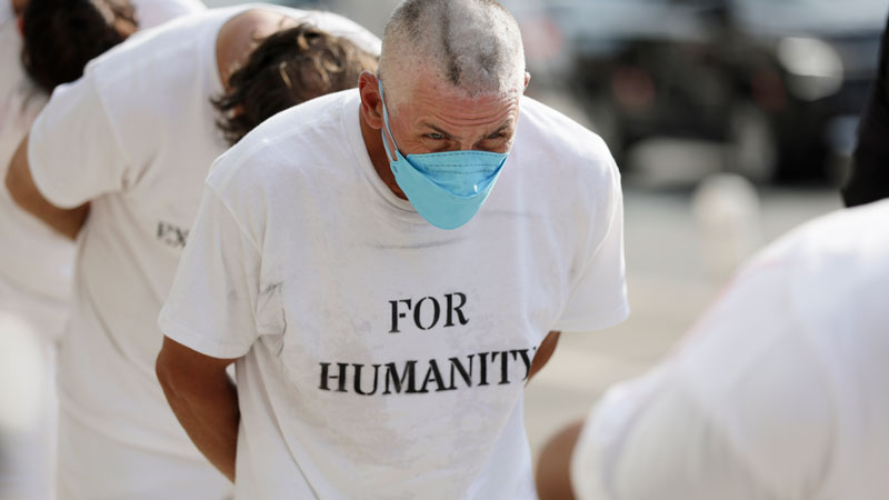 "Los Desaparecidos": Uno de los artistas es rapado, simbolizando la deshumanización de las deportaciones en una acción artística de protesta. foto EDH/ EFE