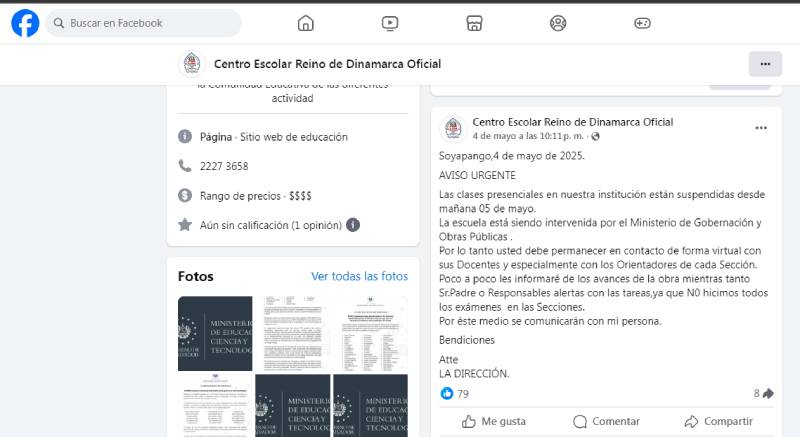 Por otra parte, el pasado 4 de mayo de 2025 la página de facebook del centro escolar posteo “Las clases presenciales en nuestra institución están suspendidas desde mañana 05 de mayo. La escuela está siendo intervenida por el Ministerio de Gobernación y Obras Públicas”. Foto EDH/ Captura de pantalla Facebook