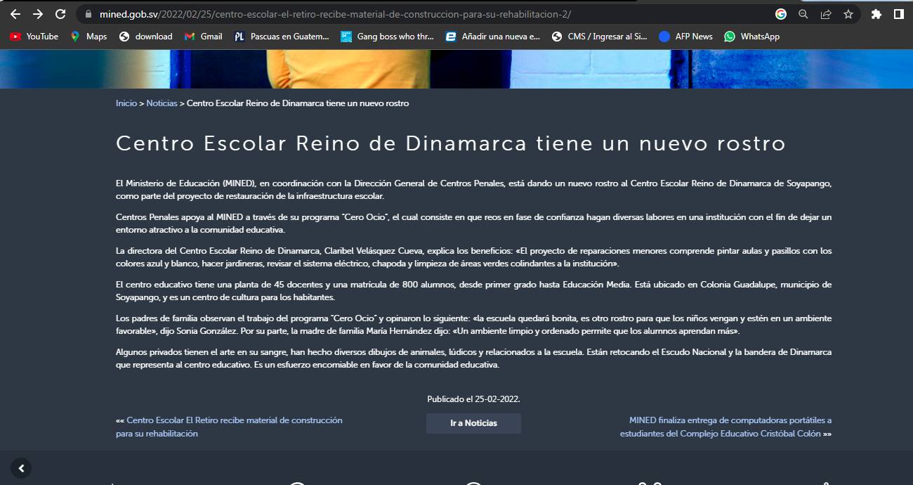 Según la página del Ministerio de Educación desde 2022 Centro Escolar Reino de Dinamarca de Soyapango, es parte del proyecto de restauración de la infraestructura escolar hasta la fecha más de 350 reos trabajan en la escuela.