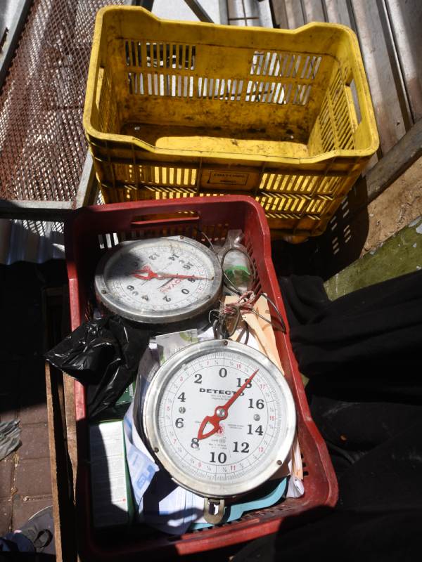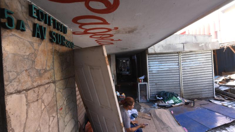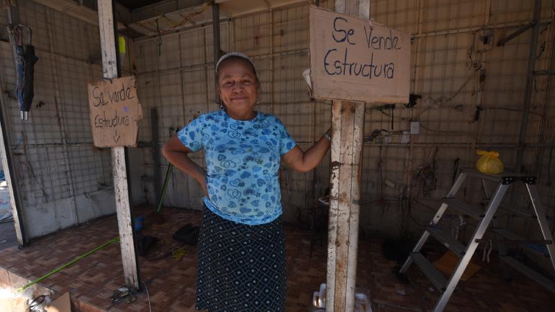 Vilma, una vendedora veterana de la 4a Calle Poniente aún, empacaba su mercadería de ropa interior en horas de la mañana del domingo. La estructura de su puesto estaba aún intacta, pues no podía costear el desarme, por lo que colgó un rótulo en él que lo ponía en venta. Foto EDH/ Menly González