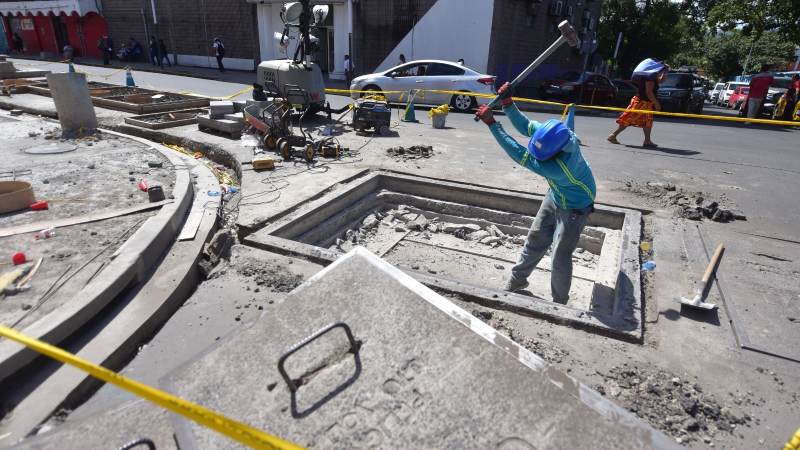 Los trabajos en la calle Darío comprenden un sistema de cableado subterráneo y la remoción de la capa asfáltica para colocar adoquines. Foto EDH / Miguel Lemus