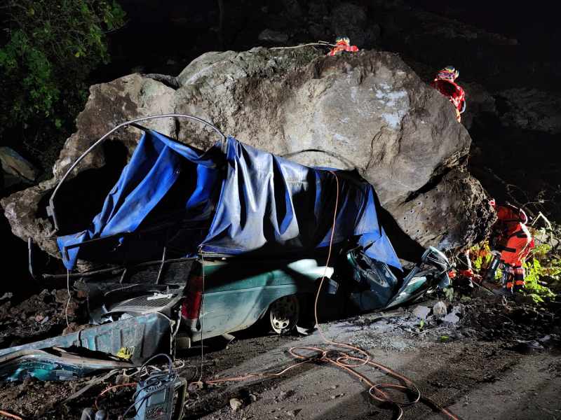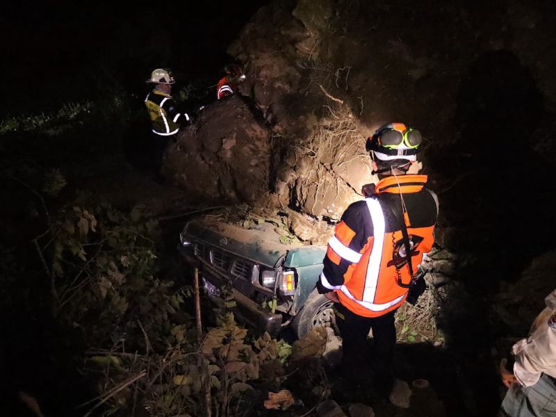 Dos personas murieron cuando su vehículo quedó sepultado bajo un deslizamiento de tierra tras una serie de terremotos que sacudieron gran parte del país centroamericano el 8 de julio. Foto EDH/ AFP BOMBEROS VOLUNTARIOS DE GUATEMALA