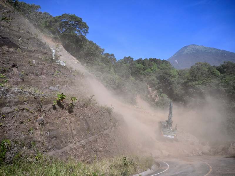 Una excavadora trabaja para despejar una carretera bloqueada por un deslizamiento de tierra después de una serie de terremotos en Santa María de Jesús, Guatemala, el 9 de julio de 2025. Foto EDH/AFP/Johan Ordoñez