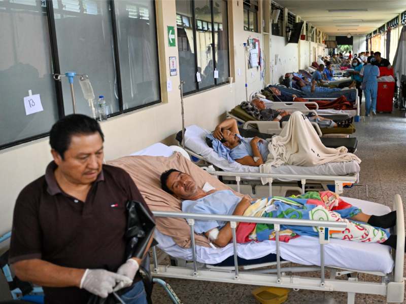 Pacientes descansan en una zona segura del Hospital El Hermano Pedro, a donde fueron reubicados tras varios sismos en Antigua, Guatemala, el 9 de julio de 2025. Foto EDH/AFP/Johan Ordoñez