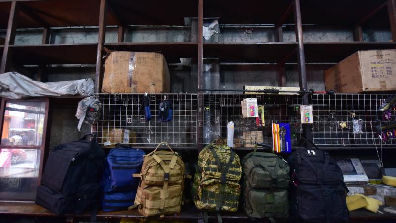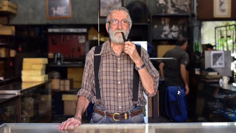 Fiel a su particular estilo, este hombre mantiene la mirada fija en la entrada de su negocio. Al llegar un cliente, suelta lo que lleva en las manos y se dispone a ofrecer sus productos o simplemente a conversar con algún curioso. Navajas, cantimploras, cañas de pescar, anzuelos, lámparas, brújulas, además de una línea de mochilas de campaña fabricadas por su equipo de colaboradores, forman parte de su variada oferta.