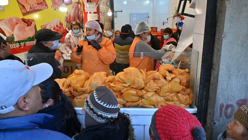 En la Garita de Lima, una concurrida zona comercial paceña, un camión descarga pollos en un puesto mayorista. Cientos de bolivianos se forman en largas filas, impacientes y crispados.