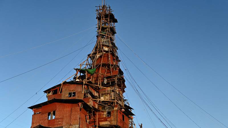 Entre los escombros de casas demolidas, la inestable torre de Chen Tianming, hecha de tablas de madera y vigas torcidas, simboliza la obstinación de un hombre solo frente al sistema.