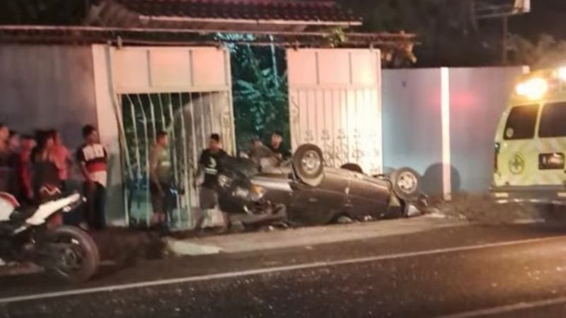 Tras el impacto, el vehículo placas P135-019 quedó volcado tras chocar con el portón de una vivienda, donde dejó daños materiales.
