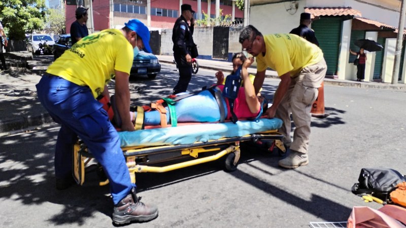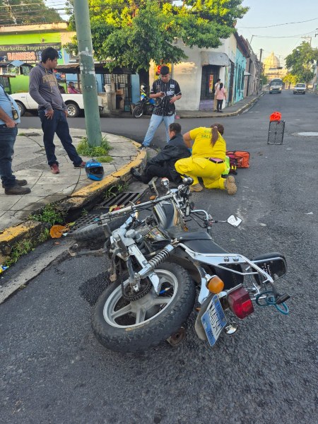 En la intersección entre la 5ª Calle Oriente y la 1ª Avenida Norte, en el centro de San Salvador, dos personas que viajaban en moto resultaron heridas luego de colisionar contra un vehículo. Ambos fueron trasladados a un hospital del Seguro Social cercano por Comandos de Salvamento.