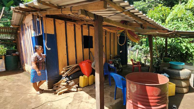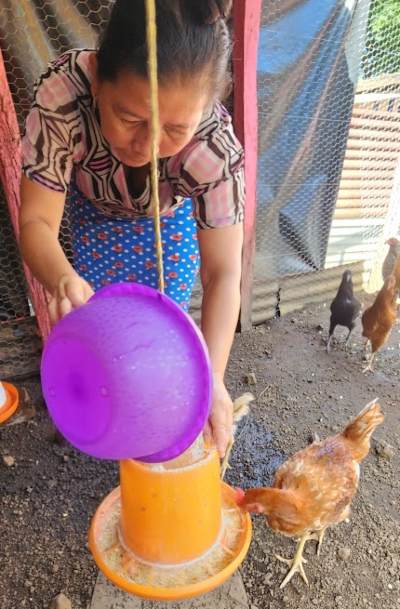 Carina Estela Aparicio, 40 años, del caserío Los Cisneros, del cantón Candelaria, distrito San Jorge, fue beneficiada con un módulo de aves ponedoras, un reservorio para la cosecha de agua y plantaciones frutales; en su hogar se dedican a la pequeña agricultura del maíz, y frijol para el consumo.Ella dice que el agua lluvia que logra recoger en el reservorio la usa para lavar ropa, regar algunas plantas y para las dos vacas.
