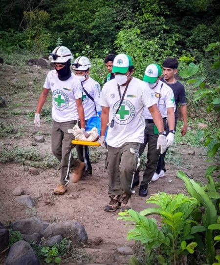 Cruz Verde Majahual y lugareños llevan el cuerpo de la víctima. Foto: Cruz Verde Salvadoreña