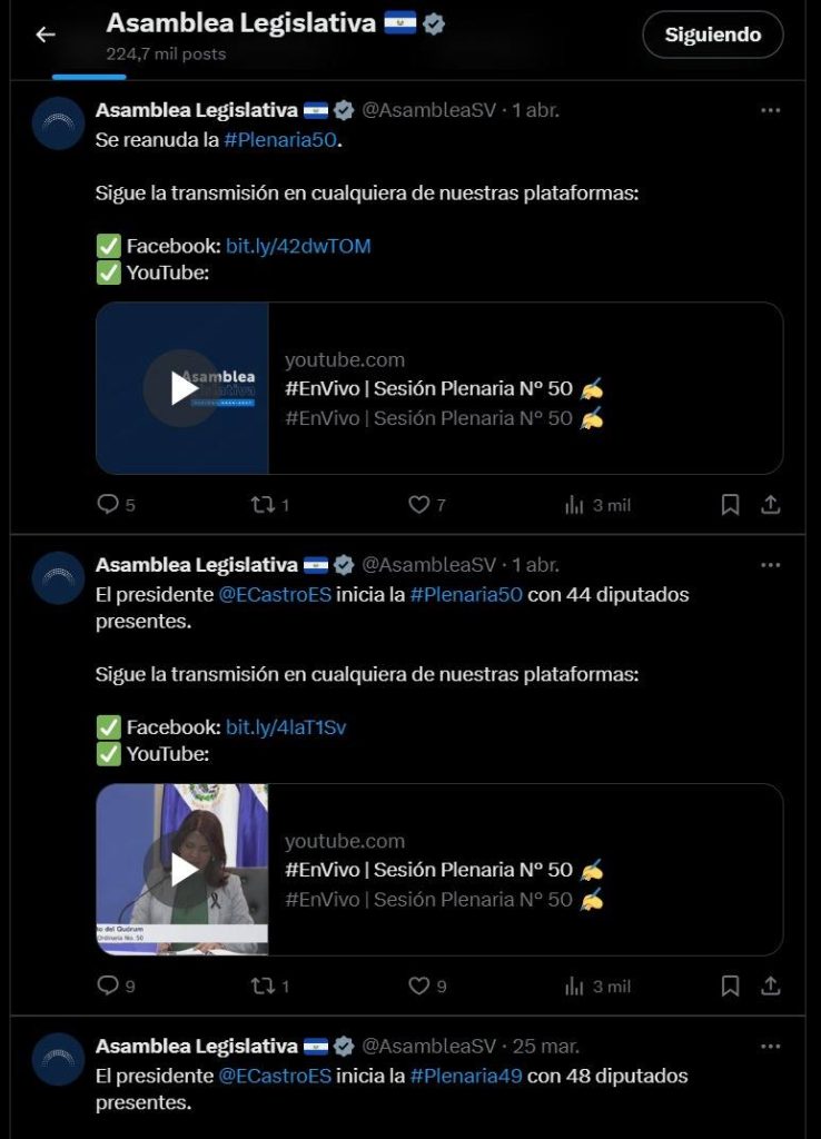En el caso de la cuenta institucional de X de la Asamblea Legislativa, está limitada a colocar los enlaces de los desarrollos de las sesiones plenarias.