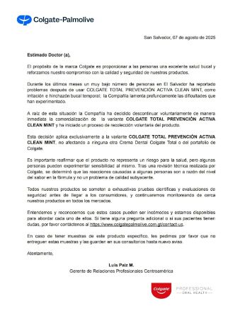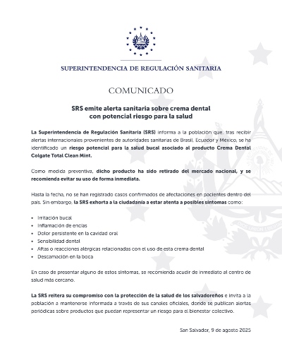 La Superintendencia de Regulación Sanitaria de El Salvador (SRS) anunció este sábado el retiro de la crema dental Colgate Total Clean Mint tras alertas por posible riesgo para la salud.
