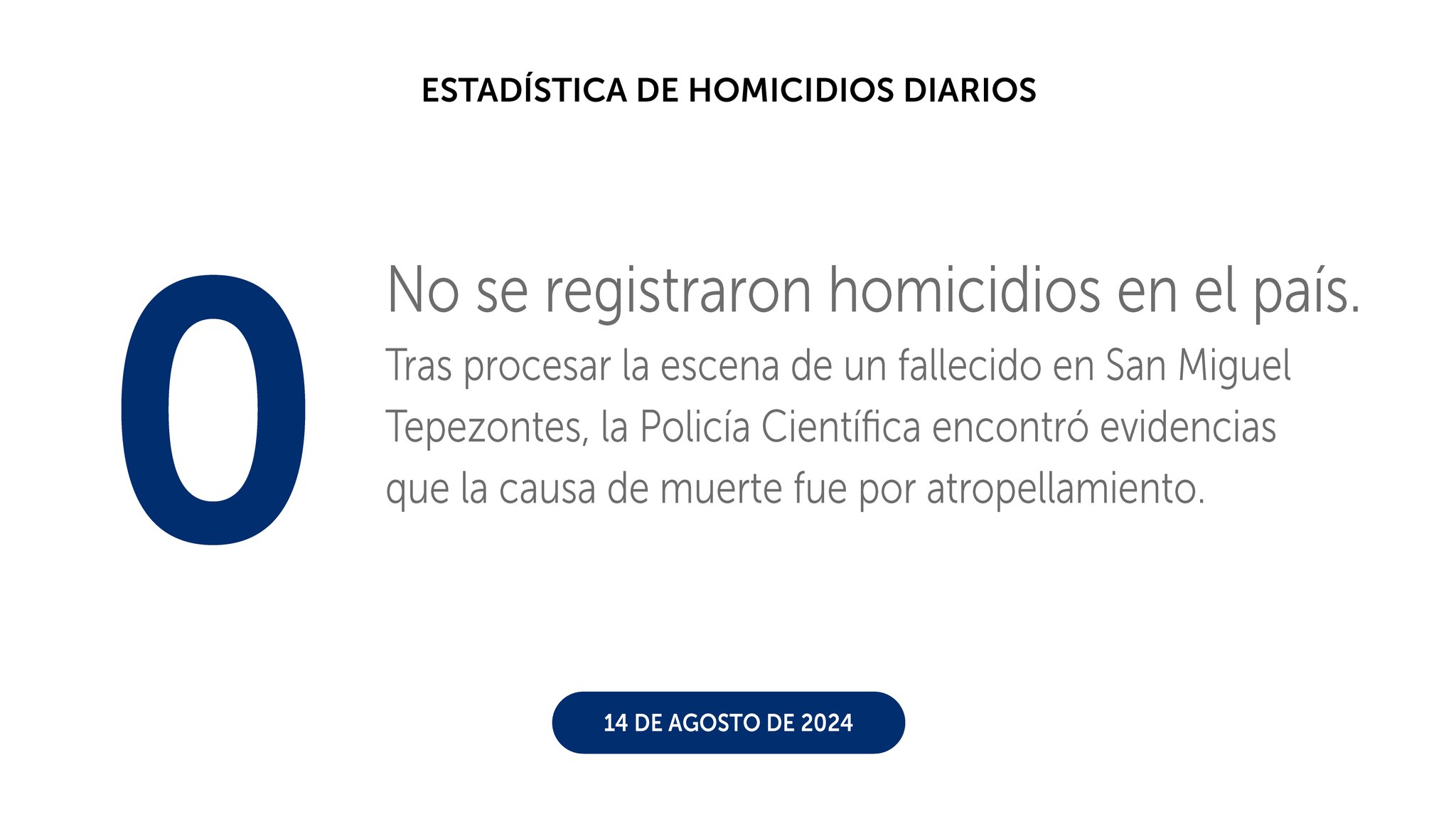 Hasta en horas de la noche, en la estadística de homicidios, confirmaron que se había finalizado el miércoles 14 de agosto, sin ningún homicidio, puesto que, las investigaciones en la escena, determinaron que el caso de la persona fallecida en San Miguel Tepezontes, se trató de un atropellamiento por un vehículo que era conducido a excesiva velocidad y que pasó arrollando a los dos hombres.