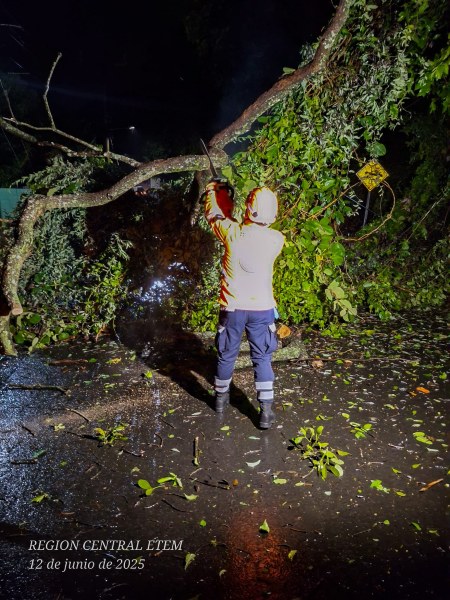 En la carretera Longitudinal del Norte, entre el desvío de Amayo y el cantón Aldeíta, en Tejutla, Chalatenango Centro, un equipo de Protección Civil removió un árbol que cayó sobre la vía.