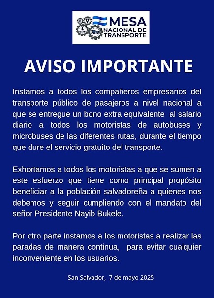Ante este panorama, la Mesa Nacional de Transporte insta a los empresarios para que entreguen un bono extra a los motoristas de buses y microbuses, y así garantizar el servicio y evitar problemas legales.