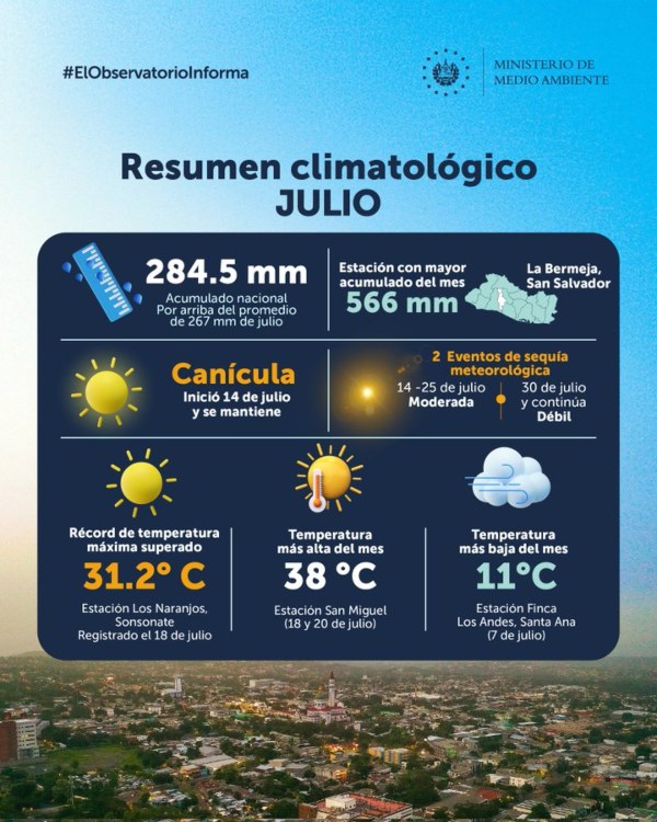 El Ministerio de Medio Ambiente y Recursos Naturales (MARN) presentó el resumen climatológico de julio, mes que estuvo marcado por temperaturas extremas de hasta 38 grados centígrados, eventos de sequía y acumulados de lluvia por encima del promedio histórico.
