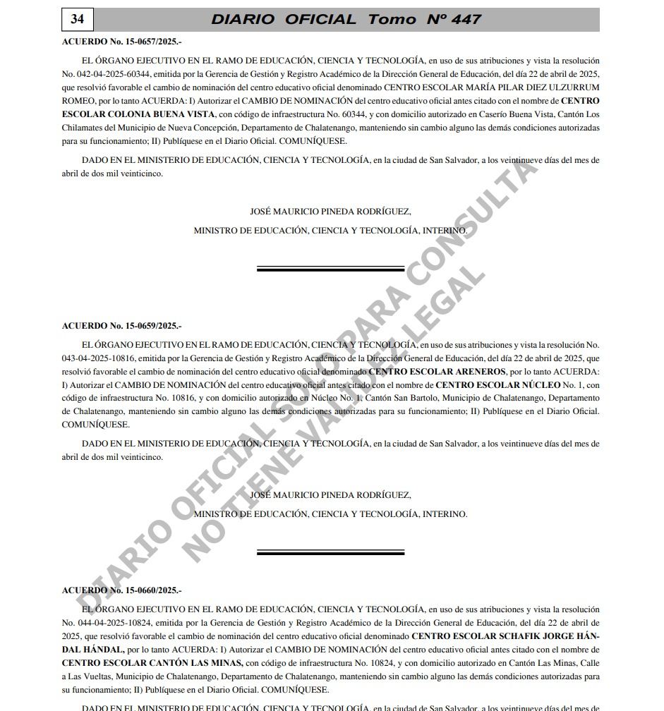 El Ministerio de Educación, Ciencia y Tecnología (MINEDUCYT) modificó los nombres de tres centros educativos en el departamento de Chalatenango, el pasado mes de abril y los acuerdos aparecen publicados en el Diario Oficial con fecha del 9 de junio.