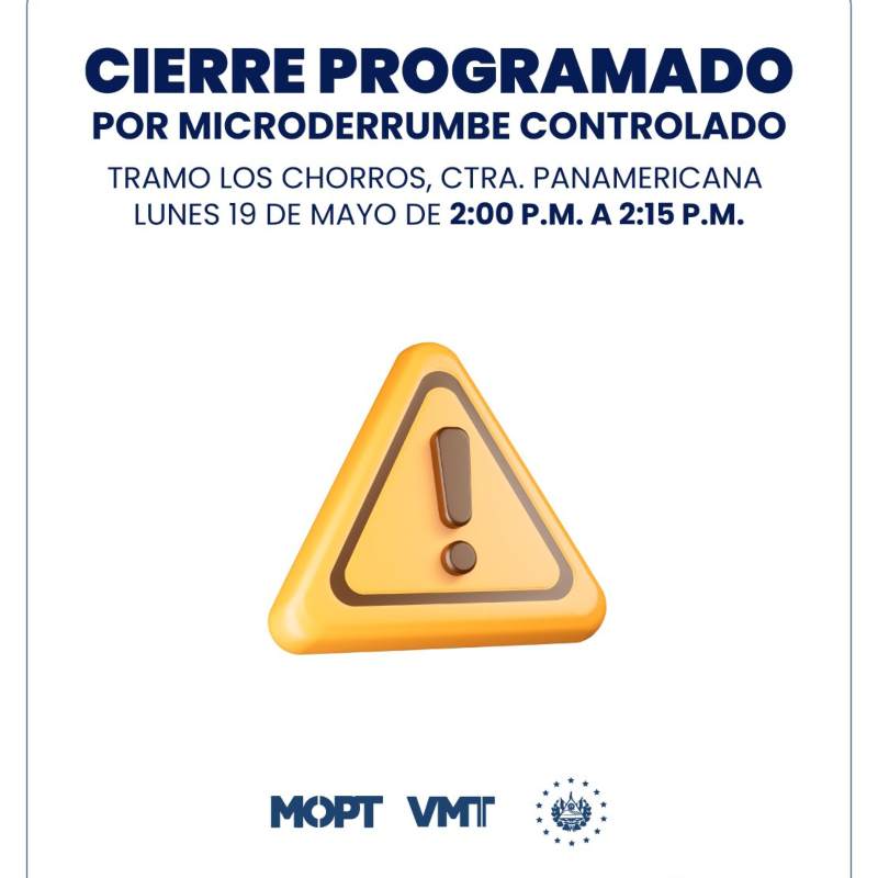 El Ministerio de Obras Públicas y de Transporte (MOPT) informó que este lunes 19 de mayo se llevará a cabo un cierre temporal en ambos sentidos del tramo conocido como Los Chorros, en la carretera Panamericana.
