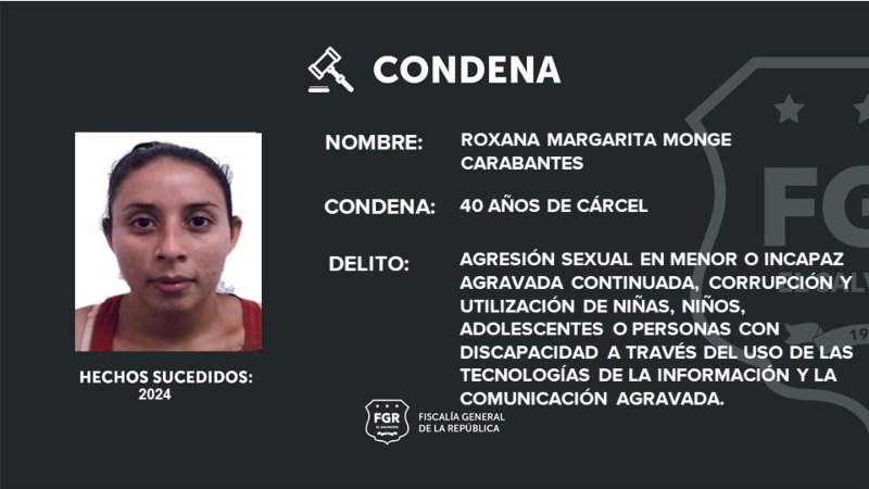 Una mujer recibió una condena de 40 años de prisión tras ser declarada culpable de tres delitos contra la libertad sexual en agravio de un menor de tres años de edad, informó este miércoles la Fiscalía General de la República.