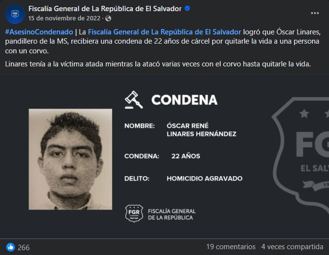 Óscar René Linares Hernández recibió la condena por el delito de homicidio agravado estando recluido en el Centro de Confinamiento del Terrorismo (CECOT), según ha confirmado la Fiscalía General de la República (FGR). Asimismo, también ha confirmado que otros tres pandilleros involucrados en el crimen aún están prófugos de la justicia.