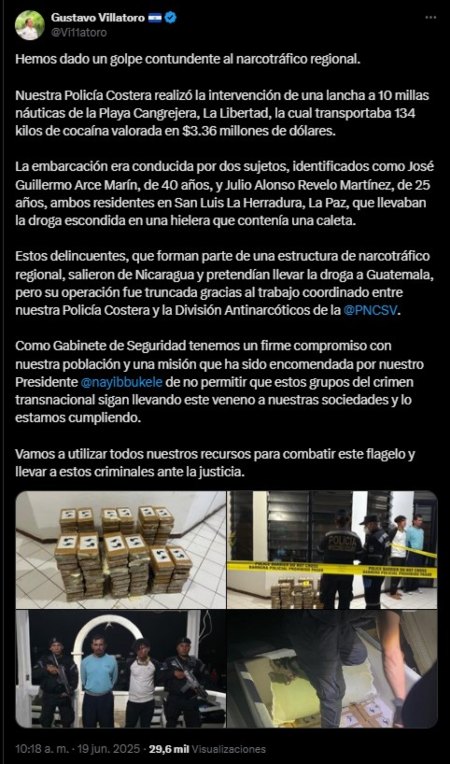 El ministro de Seguridad Pública, Gustavo Villatoro informó el 19 de junio pasado que la lancha fue interceptada por la Policía Costera a 10 millas náuticas (18.5 kilómetros) de la playa Cangrejera, en La Libertad Costa.