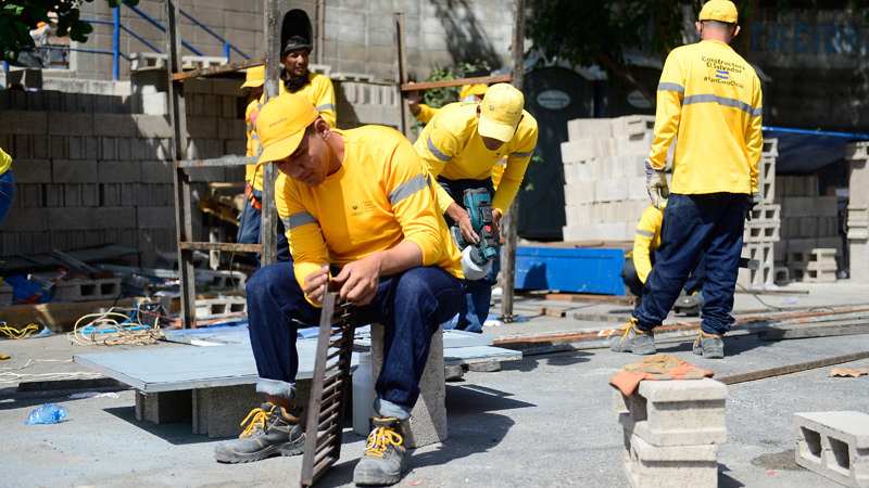 Reos con camisa de Constructora El Salvador remodelan escuelas