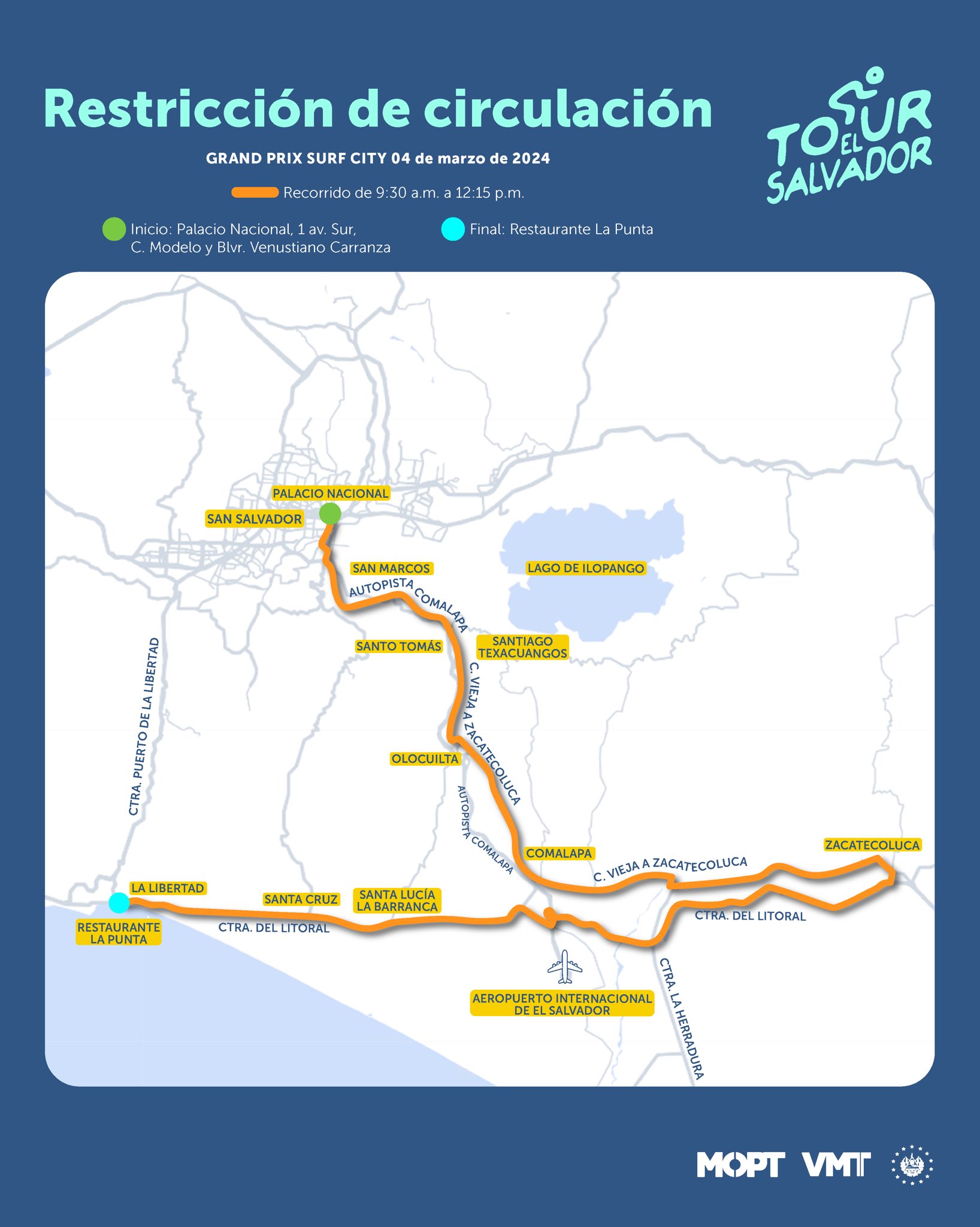 "Vamos a iniciar con un recorrido que parte del Palacio Nacional hacia la carretera Comalapa, calle antigua a Zacatecoluca y hace un retorno y toma la carretera Litoral para ir a La Libertad", dijo en conferencia de prensa, Nelson Reyes, viceministro de Transporte. El circuito terminará en el restaurante La Punta, en la carretera Litoral.