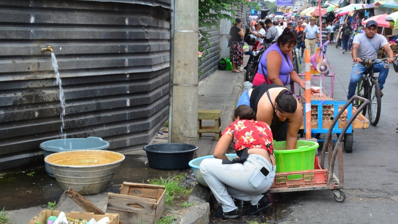 Comerciantes lavan sus productos en un grifo que está disponible desde el mercado de Santa Ana. Las condiciones donde comercializan su producto no son las adecuadas, coincidieron varias personas consultadas. Foto EDH/Cristian Díaz